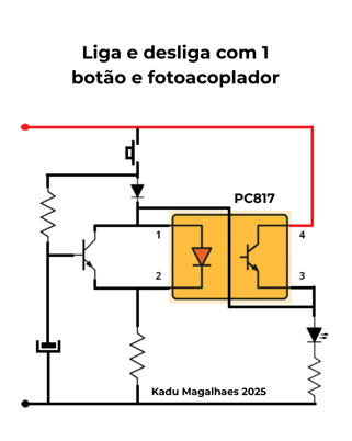 A ideia aqui é montar um circuito Liga e Desliga usando um fotoacoplador e apenas um único botão. Mas pra isso funcionar do jeito certo, a gente teve que usar uma solução genial: um circuito temporizador trabalhando junto com o fotoacoplador para controlar tudo com precisão.
